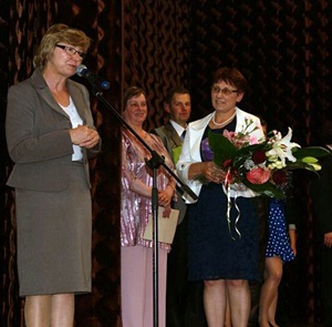 Na zakończenie uroczystości ponownie głos zabrała pani Dyrektor, która zaprosiła na scenę panią Marię Kubiak - nauczycielkę języka polskiego. Pani Maria w tym roku zakończyła pracę zawodową w naszej szkole. Uczyła tutaj języka polskiego, a także rosyjskiego. Panią Kubiak pamiętają nawet nasi rodzice, bo to ich zaczynała uczyć. Grono pedagogiczne, uczniowie oraz Rada Rodziców naszej szkoły podziękowali pani Marii Kubiak za wspaniałe lata współpracy z Zespołem Szkół im. Ks. Teodora Kurpisza w Bukówcu Górnym. Jak powiedziała pani Maria: Kończę pracę zawodową w tej szkole, ale nie kończę mojej przygody z Bukówcem Górnym.