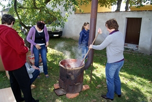 Wielki ruch panował też w kolejnej pracowni, gdzie odbywały się warsztaty rzeźbienia prowadzone przez pana Jerzego Sowijaka oraz warsztaty gdzie można było nauczyć się robić bukowieckiego „pająka” prowadzone przez Basie Dragan. Ogromną popularnością cieszyły się również powidła, które od wczesnego ranka smażyły się w tradycyjnym kotle koprowym. Jak zwykle chętnych do ich zakupu było dużo więcej niż usmażonych porcji. Bardzo wielu gości podziwiało stałą atrakcję festynu - wystawę prac plastycznych uczniów naszej szkoły. Rodzice z dumą oglądali rysunki swoich pociech, a wszystkich zadziwiały różnorodne techniki wykonanych prac.