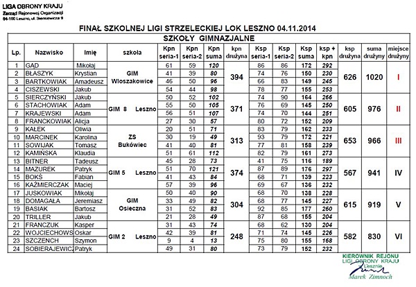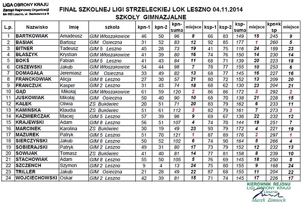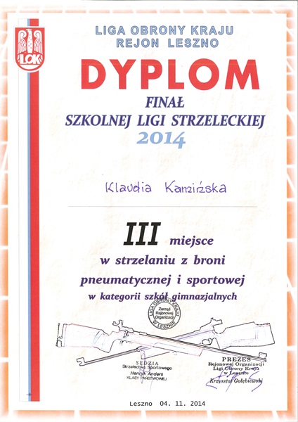 Dnia 4 listopada 2014 w Lesznie reprezentacja naszej szkoły wzięła udział Finale Szkolnej Ligi Strzeleckiej 2014, organizowanym przez Rejonowy Oddział Ligi Obrony Kraju w Lesznie. Zawody te są całorocznym podsumowaniem umiejętności strzeleckich zawodników z naszego rejonu i przeprowadzane są w kategoriach drużynowych oraz indywidualnych.